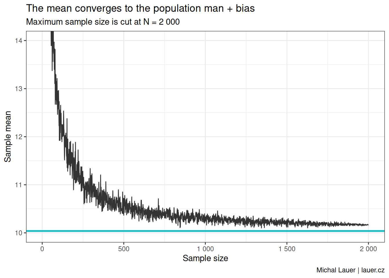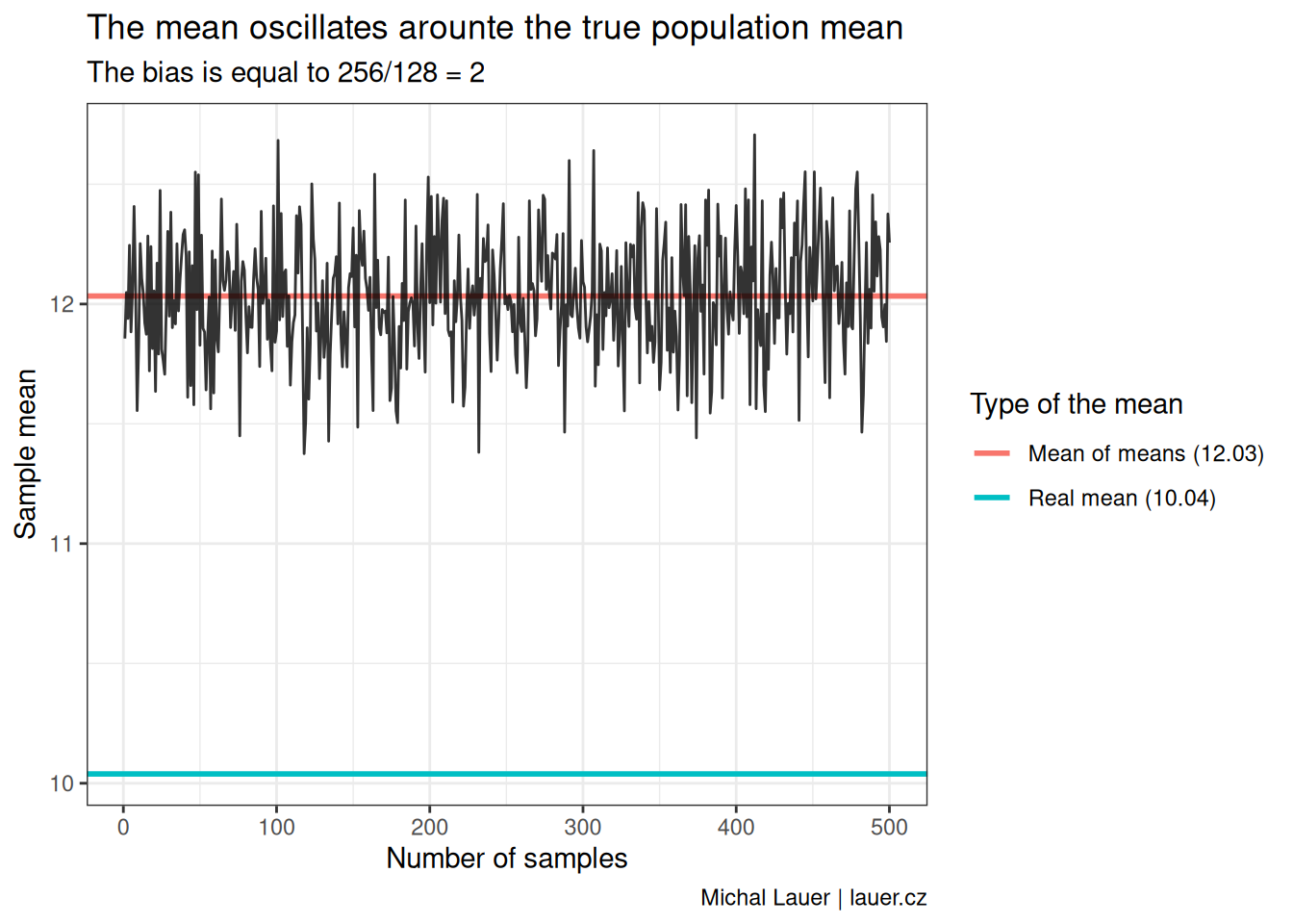 Figure 1 shows that the sample mean oscillates around the value 12.03. The real mean (computed from the population, which is rarely known) is 10.04. As we know from the previous text, the bias for the crazy average is \(256/n\), which in our case equals two! This shows that the mean of all means is, on average, the true population mean plus bias.